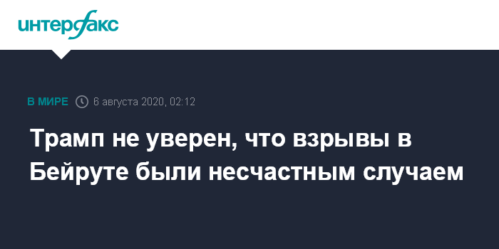 Накануне Трамп заявил, что он не исключает, что серия взрывов в Бейруте - никакой не несчастный случай. Он объяснил, что общался на эту тему с военными США, и те, посмотрев видео взрыва, предположили, что это может быть атакой. При этом следователи в Ливане, как сообщалось, пока склоняются к тому, что причина трагедии - халатность портовых работников.