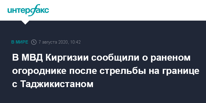 Москва. 7 августа. INTERFAX.RU - 65-летний житель приграничного села Кок-Таш в Баткенской области Киргизии был ранен в результате стрельбы вечером 6 августа, сообщили в МВД Киргизии. По данным министерства, когда он работал на своем участке, со стороны Таджикистана начали стрелять. Ему потребовалась госпитализация.