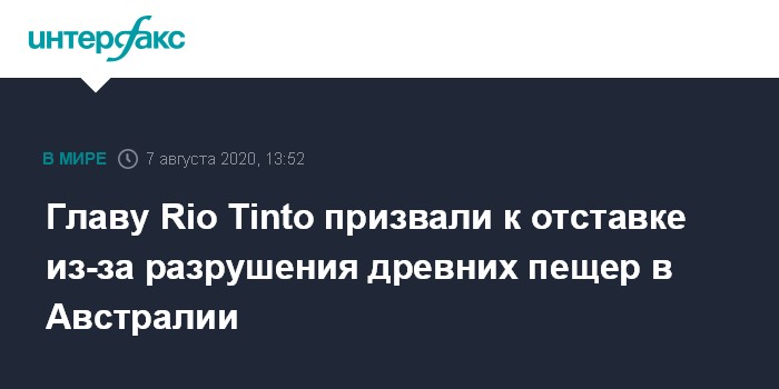 Москва. 7 августа. INTERFAX.RU - Австралийский центр корпоративной ответственности (Australian Centre for Corporate Responsibility, ACCR) призвал главного исполнительного директора Rio Tinto Жана-Себастьяна Жака уйти в отставку в связи с разрушением горнодобывающей компанией пещер коренного населения Австралии, пишет Financial Times.