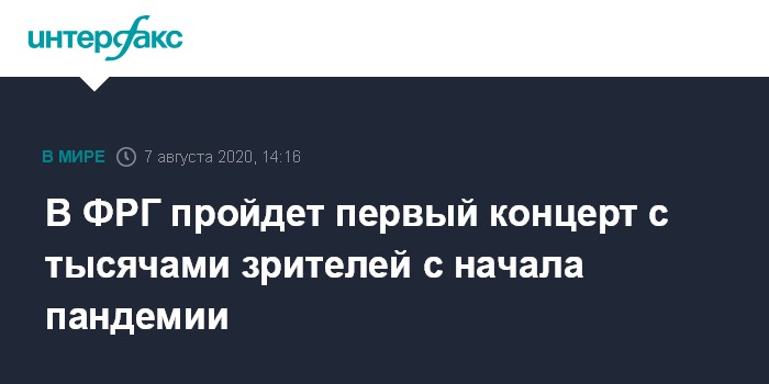 Москва. 7 августа. INTERFAX.RU - Первый в ФРГ с начала пандемии коронавируса COVID-19 концерт в присутствии тысяч зрителей запланирован на 4 сентября в Дюссельдорфе, сообщает в пятницу агентство EFE.