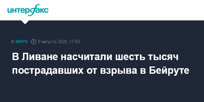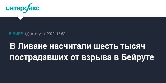 Москва. 8 августа. INTERFAX.RU - Число пострадавших от мощного взрыва, произошедшего на этой неделе в Бейруте, достигло шести тысяч, сообщает в субботу Минздрав Ливана со ссылкой на обновленные данные.