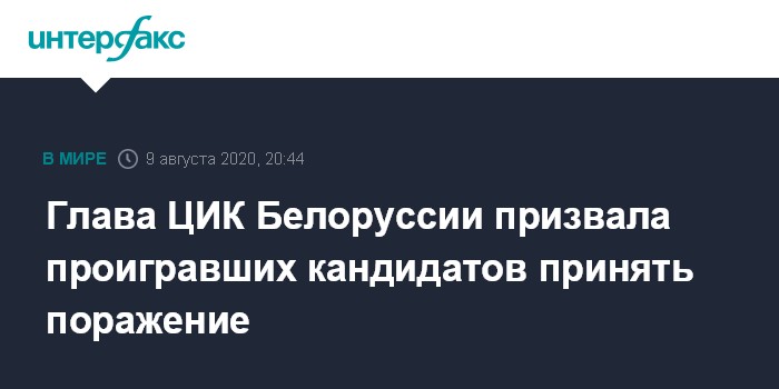 Москва. 9 августа. INTERFAX.RU - Глава Центризбиркома Белоруссии Лидия Ермошина призвала проигравших на выборах кандидатов в президенты спокойно принять поражение, поздравить победителя и не "будоражить" массы.