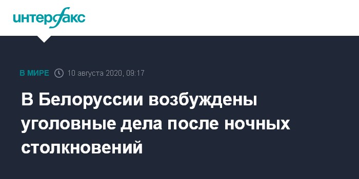 Москва. 10 августа. INTERFAX.RU - Следственный комитет Белоруссии сообщил, что по фактам массовых беспорядков и применения насилия к милиционерам в Минске и других городах возбуждены уголовные дела.