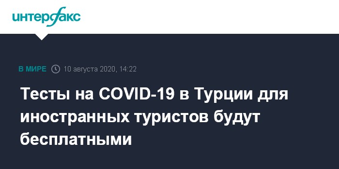 Москва. 10 августа. INTERFAX.RU - Посольство РФ в Турции разъяснило порядок действий турецких властей в отношении иностранных туристов в условиях сохраняющихся рисков заражения коронавирусом; в дипмиссии, в частности, сообщили, что тесты на коронавирус зарубежным гостям будут делать бесплатно.
