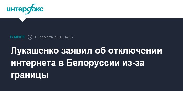 Москва. 10 августа. INTERFAX.RU - Интернет в Белоруссии отключают не власти, заявил президент республики Александр Лукашенко в понедельник на встрече с председателем главой миссии наблюдателей от СНГ Сергеем Лебедевым.
