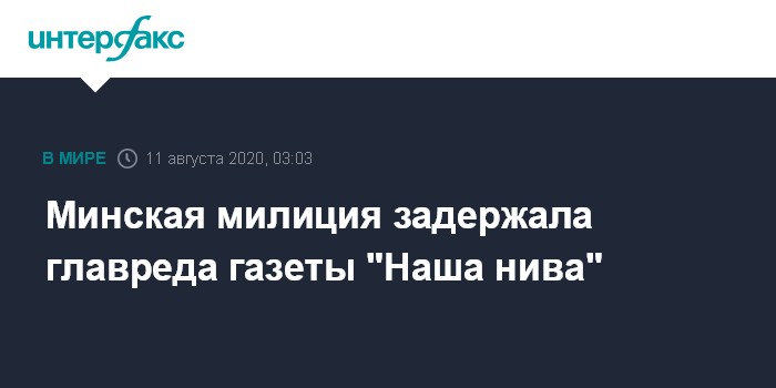 Москва. 11 августа. INTERFAX.RU - Минская милиция во вторник задержала главного редактора белорусской газеты "Наша нива" Егора Мартиновича, сообщила редакция в телеграме во вторник.