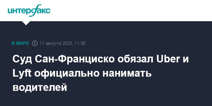 Москва. 11 августа. INTERFAX.RU - Верховный суд Сан-Франциско своим решением обязал сервисом заказа такси Uber Technologies и Lyft классифицировать водителей как своих сотрудников, пишет The Wall Street Journal. Это решение принято по иску группой прокуроров Калифорнии.