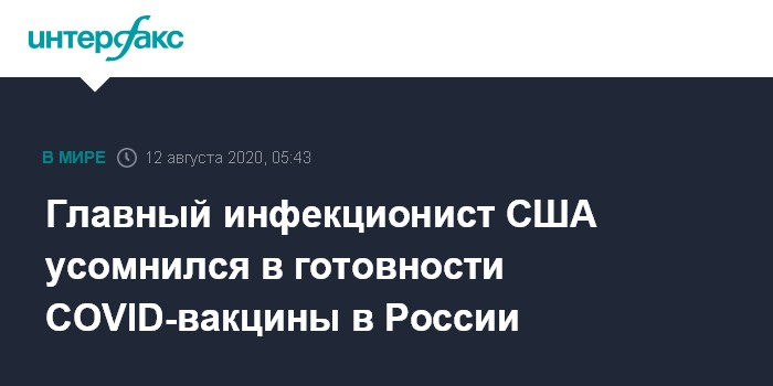 Москва. 12 августа. INTERFAX.RU - Главный национальный эксперт США по инфекционным заболеваниям Энтони Фаучи заявил, что у него есть серьезные сомнения по поводу заявления России о наличии у нее вакцины, готовой к использованию в борьбе с COVID-19.