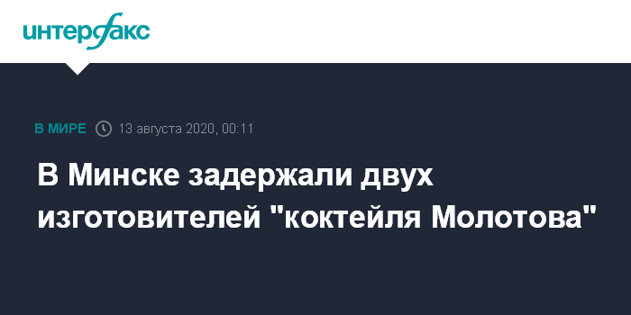Москва. 13 августа. INTERFAX.RU - МВД Белоруссии сообщило о задержании в Минске двух изготовителей "коктейля Молотова".
