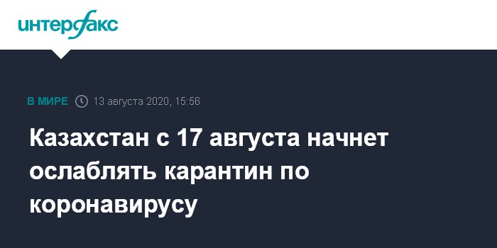 Москва. 13 августа. INTERFAX.RU - Государственная комиссии под председательством премьера Казахстана Аскара Мамина приняла решение о поэтапном ослаблении с понедельника, 17 августа, карантинных мер, введенных в стране с 5 июля, сообщила пресс-служба правительства в четверг.