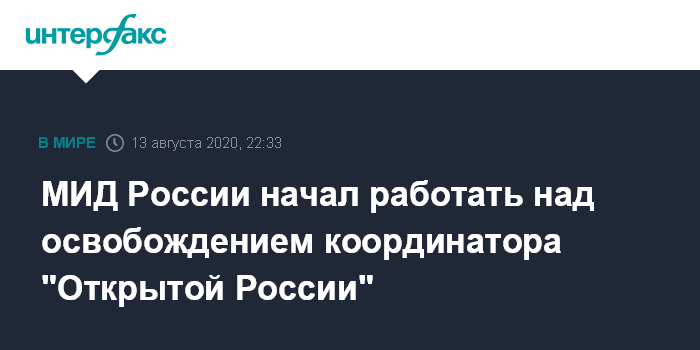 Москва. 13 августа. INTERFAX.RU - МИД России прикладывает усилия для освобождения задержанного в Белоруссии координатора "Открытой России" Артема Важенкова, сообщил "Интерфаксу" в четверг представляющий его интересы адвокат "Правозащиты Открытки" Антон Гашинский.