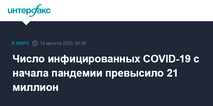 Москва. 14 августа. INTERFAX.RU - С начала пандемии коронавируса COVID-19 в мире суммарно выявлено 21 062 252 заразившихся, сообщил в ночь на пятницу портал Worldometer.