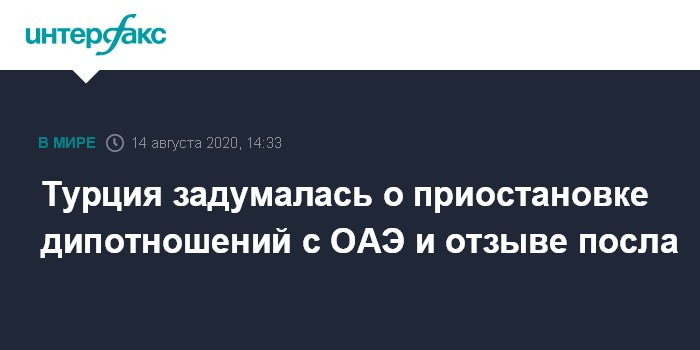 Москва. 14 августа. INTERFAX.RU - Президент Турции Реджеп Тайип Эрдоган в пятницу не исключил, что в ответ на соглашение о нормализации отношений между ОАЭ и Израилем, Анкара может отозвать своего посла из Абу-Даби.