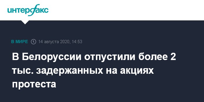 Москва. 14 августа. INTERFAX.RU - Уже более 2 тыс. человек, задержанных ранее в ходе акций протеста в Белоруссии, отпущены из мест содержания заключенных, сообщили в МВД республики в пятницу.