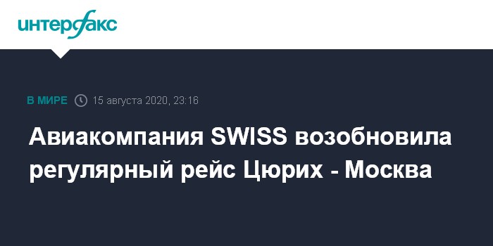 Москва. 15 августа. INTERFAX.RU - Авиакомпания SWISS (входит в группу Lufthansa) совершила первый после возобновления авиасообщения между Россией и Швейцарией регулярный рейс из Цюриха в Москву и обратно.