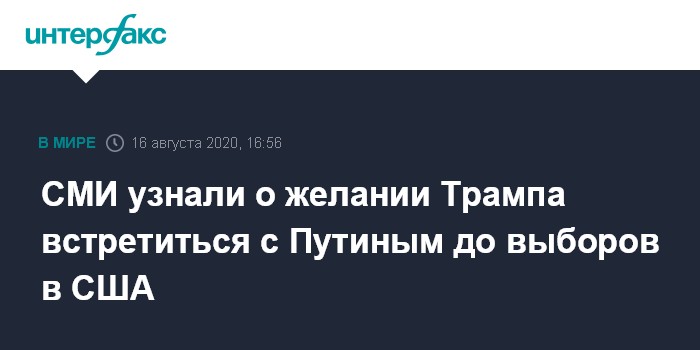 Москва. 16 августа. INTERFAX.RU - Президент США Дональд Трамп заявил в своем окружении, что хотел бы встретиться с президентом России Владимиром Путиным до ноябрьских выборов, сообщил в воскресенье телеканал NBC со ссылками на четыре информированных источника.