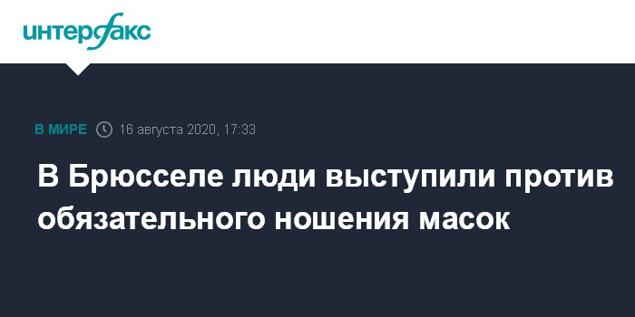 Москва. 16 августа. INTERFAX.RU - Несколько сотен человек собрались в Брюсселе в воскресенье на акцию у здания министерства финансов Бельгии, чтобы протестовать против введенного правительством столичного региона обязательного ношения масок против коронавируса, сообщил телеканал RTBF.