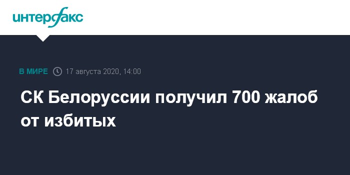 Москва. 17 августа. INTERFAX.RU - Следственный комитет Белоруссии получил больше 600 жалоб от тех, кто получил травмы при задержании и еще около ста от тех, что был травмирован уже в местах временного содержания, сообщило ведомство в своем телеграм-канале.