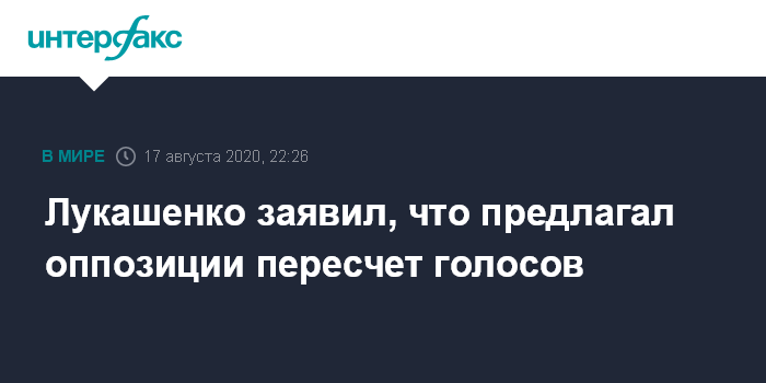 Москва. 17 августа. INTERFAX.RU - Президент Белоруссии Александр Лукашенко во время посещения Минского завода колесных тягачей (МЗКТ) заявил, что в воскресенье предлагал своим политическим оппонентам провести пересчет голосов на выборах, но те отказались.