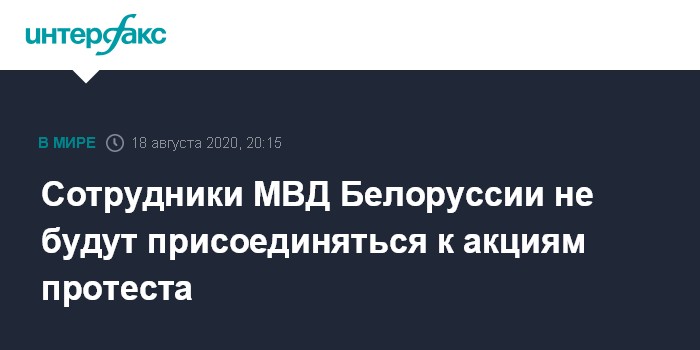 Москва. 18 августа. INTERFAX.RU - Сотрудники МВД Белоруссии не намерены увольняться и присоединятся к участникам акций протеста, сообщила в своем телеграм-канале официальный представитель МВД Ольга Чемоданова.