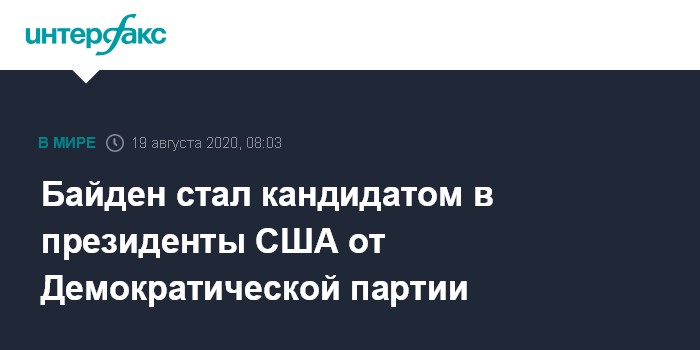 Москва. 19 августа. INTERFAX.RU - Бывший вице-президент США Джо Байден избран кандидатом в президенты США от Демократической партии, свидетельствуют результаты голосования на прошедшей в онлайн режиме конвенции (съезде).