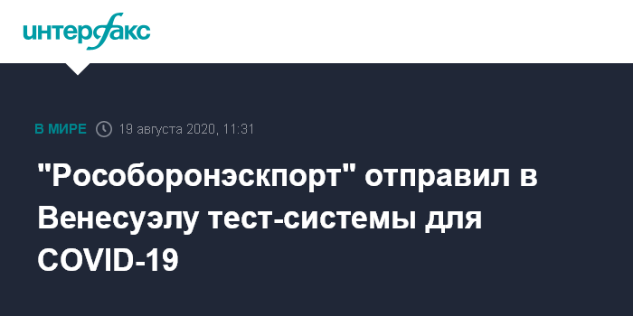 Москва. 19 августа. INTERFAX.RU - "Рособоронэскпорт" сообщил, что отправил в Венесуэлу гуманитарную помощь для борьбы с коронавирусной инфекцией, в том числе лекарства и российские тест-системы.