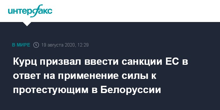 Москва. 19 августа. INTERFAX.RU - Канцлер Австрии Себастьян Курц заявил в среду в преддверии саммита ЕС, что выступает за введение санкций ЕС против повинных в насилии в отношении протестующих в Белоруссии, передает телеканал ORF.