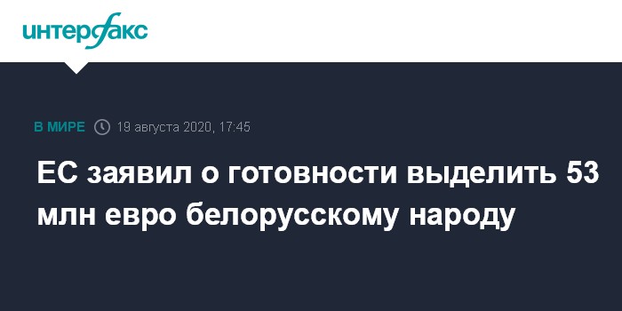 Москва. 19 августа. INTERFAX.RU - Председатель Европейской комиссии Урсула фон дер Ляйен заявила о готовности материально поддержать мирный переход власти в Белоруссии, выделив средства для нужд населения страны - в общей сложности 53 млн евро.