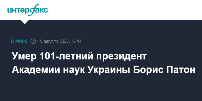 Москва. 19 августа. INTERFAX.RU - Президент Национальной академии наук Украины (НАНУ) Борис Патон скончался на 102-м году жизни, сообщил президент Украины Владимир Зеленский в телеграм-канале.