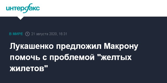 Москва. 21 августа. INTERFAX.RU - Президент Белоруссии Александр Лукашенко ответил президенту Франции Эммануэлю Макрону на его предложение стать посредником вместе канцлером ФРГ Ангелой Меркель и председателем Европейского совета Шарлем Мишелем в диалоге действующего режима с белорусским гражданским обществом.