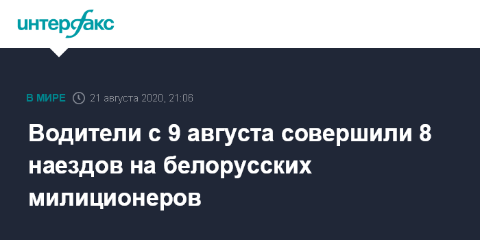 Москва. 21 августа. INTERFAX.RU - На сотрудников правоохранительных органов с 9 августа совершено 8 наездов, заявил начальник главного управления ГАИ МВД Белоруссии Дмитрий Корзюк.