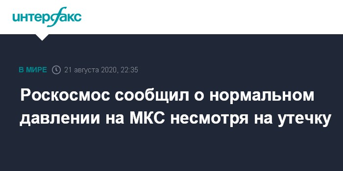 Москва. 21 августа. INTERFAX.RU - Давление в модулях Международной космической станции (МКС), где идёт поиск утечки воздуха, остаётся нормальным, сообщили "Интерфаксу" в пресс-службе "Роскосмоса".