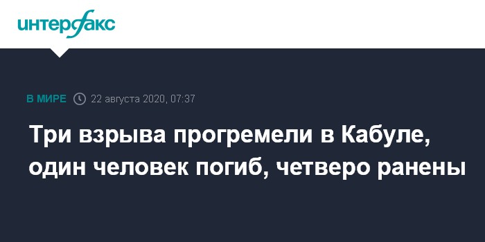 Москва. 22 августа. INTERFAX.RU - В Кабуле в субботу утром в разных частях города произошло три взрыва, в результате которых, по предварительным данным, погиб один и ранены четыре человека, сообщает полиция афганской столицы.