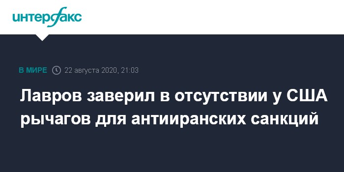 Москва. 22 августа. INTERFAX.RU - У США нет юридических рычагов для реализации намерений по восстановлению международных санкций в отношении Ирана, Россия попытается удержать Вашингтон от шагов в этом направлении, заявил в субботу глава МИД РФ Сергей Лавров.