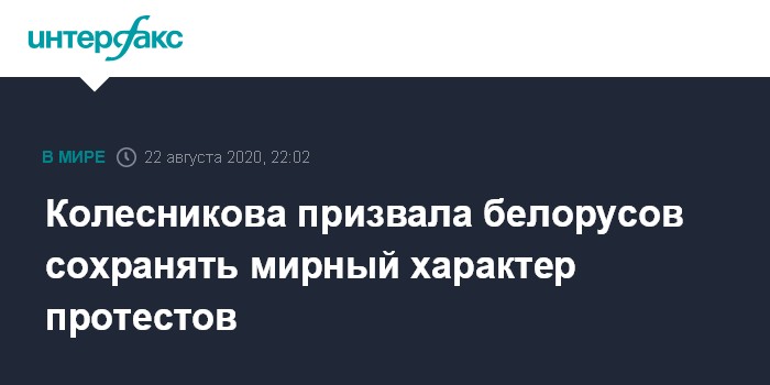 Москва. 22 августа. INTERFAX.RU - Член координационного совета оппозиции, соратница экс-кандидата в президенты Светланы Тихановской Мария Колесникова на митинге у Дома правительства в Минске призвала белорусов к продолжению мирных протестов.