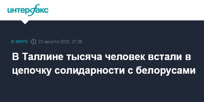 Москва. 23 августа. INTERFAX.RU - В столице Эстонии Таллине вечером состоялась акция в поддержку белорусской оппозиции - живая цепочка "Путь свободы", - организованная местными белорусами и их эстонскими сторонниками.