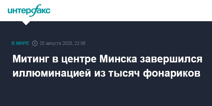Москва. 25 августа. INTERFAX.RU - Митинг сторонников экс-кандидата в президенты Белоруссии Светланы Тихановской на площади Независимости в Минске завершился поздно вечером во вторник иллюминацией из нескольких тысяч фонариков, включенных на мобильных телефонах участников.