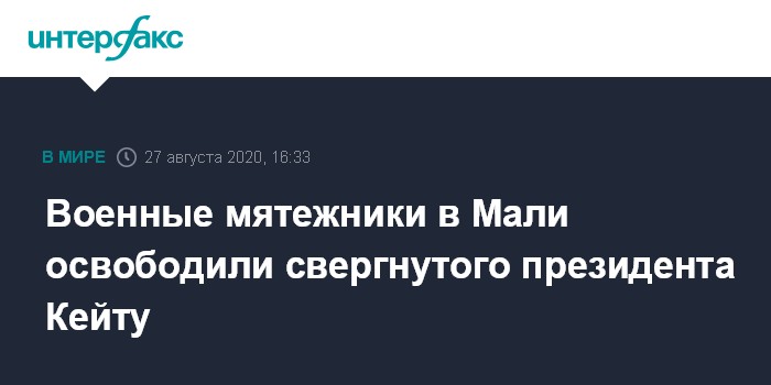 Москва. 27 августа. INTERFAX.RU - Свергнутый в ходе военного переворота 18 августа президент Мали Ибрагим Бубакар Кейта был освобожден в четверг. Об этом сообщила газета Le Figaro со ссылкой на представителя военных, поднявших мятеж.
