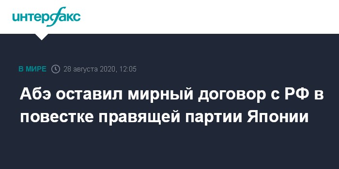Москва. 28 августа. INTERFAX.RU - Глава правительства Японии Синдзо Абэ, объявивший в пятницу о намерении покинуть этот пост, выразил сожаление, что в бытность премьером не смог обеспечить подписание мирного договора с Россией.
