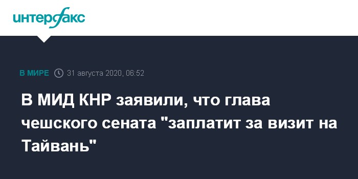 Москва. 31 августа. INTERFAX.RU - Глава МИД КНР Ван И заявил, что спикер Сената Чехии Милош Выстрчил "заплатит высокую цену" за официальный визит на Тайвань.