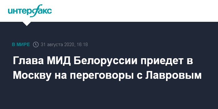 Москва. 31 августа. INTERFAX.RU - Глава МИД РФ Сергей Лавров, как ожидается, в среду в Москве проведет переговоры с белорусским коллегой Владимиром Макеем, сообщила в понедельник официальный представитель МИД России Мария Захарова.