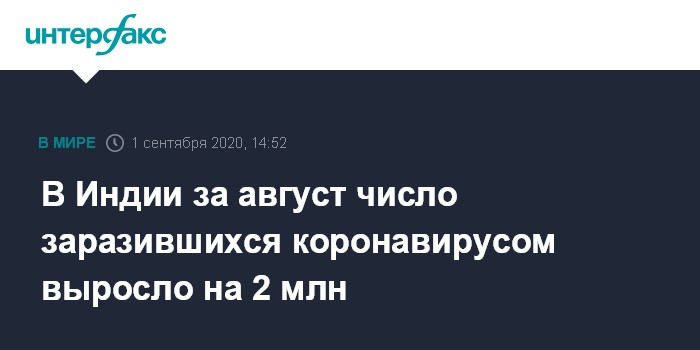 Москва. 1 сентября. INTERFAX.RU - Почти 2 млн новых случаев заболевания коронавирусом зарегистрировано в Индии в августе. Это худший месячный показатель по всем мире, пишет "Би-би-си".