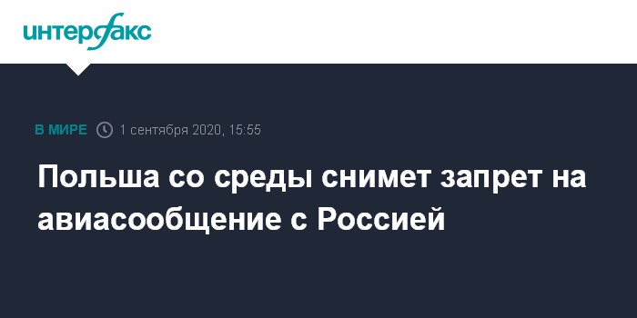 Москва. 1 сентября. INTERFAX.RU - Власти Польши исключили Россию из списка стран, с которыми из-за пандемии коронавируса запрещено прямое авиасообщение, сообщило во вторник польское радио.