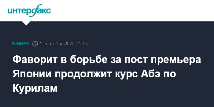Москва. 2 сентября. INTERFAX.RU - Генеральный секретарь кабинета министров Японии Есихидэ Суга, который считается основным претендентом на пост премьера страны, заявил, что намерен придерживаться курса уходящего премьера Синдзо Абэ по вопросу Курильских островов.