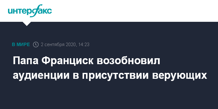 Москва. 2 сентября. INTERFAX.RU - Папа римский Франциск в среду провел первую за время пандемии аудиенцию в присутствии верующих, сообщает Vatican News.