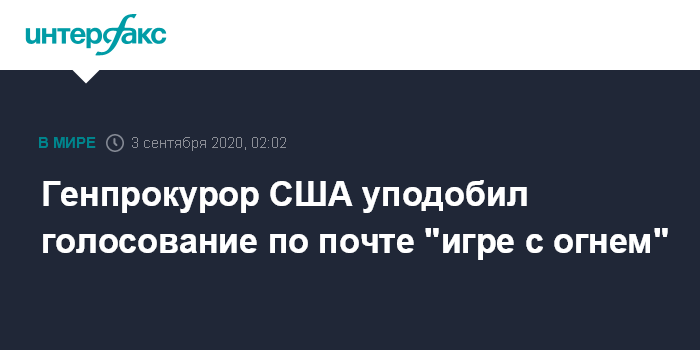 Москва. 3 сентября. INTERFAX.RU - Генпрокурор США Уильям Барр считает, что голосование по почте равносильно "игре с огнем".