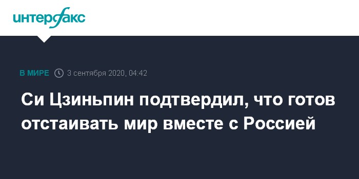 "Россия и Китай являются постоянными членами Совета безопасности ООН и несут большую ответственность за развитие мира во всем мире. Я готов продолжать работать вместе с вами (. . .) и вести Китай и Россию углублению китайско-российских отношений всеобъемлющего партнерства и стратегического взаимодействия, вместе с международным сообществом твердо отстаивать победные результаты Второй мировой войны и международную справедливость", - говорится в поздравительно телеграмме китайского лидера в адрес президента РФ Владимира Путина по случаю 75-й годовщины окончания Второй мировой войны.