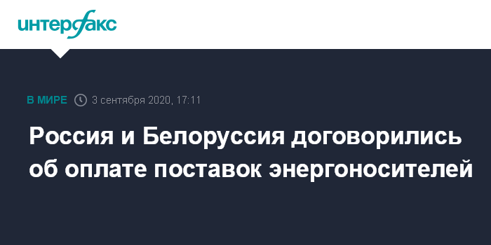 Москва. 3 сентября. INTERFAX.RU - Москва и Минск достигли договоренностей по оплате энергоносителей, заявил премьер-министр РФ Михаил Мишустин в четверг на переговорах российской и белорусской правительственных делегаций в Минске.