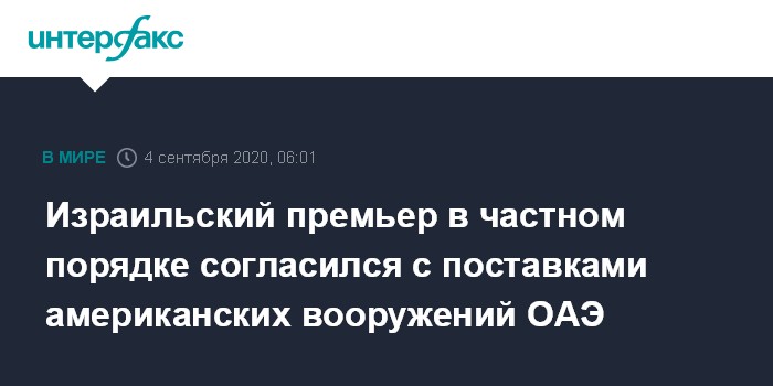 Москва. 4 сентября. INTERFAX.RU - Премьер-министр Израиля Биньямин Нетаньяху "слукавил", заявляя публично, что выступает против продажи США вооружений Объединенным Арабским Эмиратам, на деле в частном порядке согласился с такими планами администрации президента Дональда Трампа, сообщила газета The New York Times.