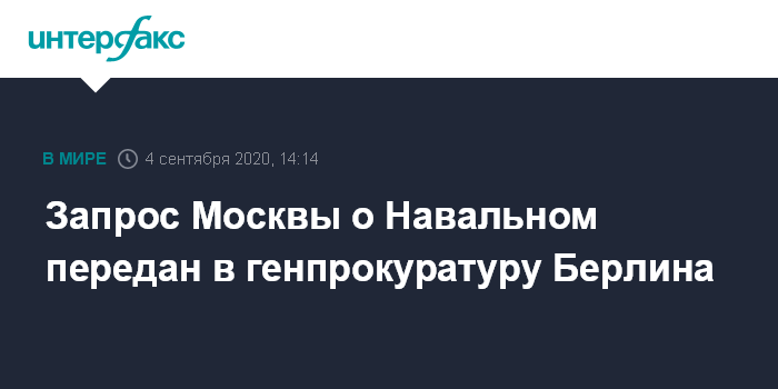 Москва. 4 сентября. INTERFAX.RU - Запрос российской стороны по делу об отравлении Алексея Навального утром 4 сентября был передан генпрокуратуре Берлина. Об этом сообщила представитель Минюста Германии.